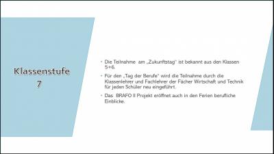 Berufsorientierung wird an unserer Schule großgeschrieben und beginnt bereits in der siebten Klasse mit dem BRAFO-Projekt.