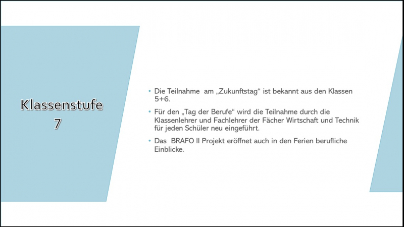 Da war das BOP (Berufsorientierungsprojekt) für die 8. Klassen im ersten Halbjahr und auch die 7. Klassen konnten viele Erfahrungen über das Brafo-Projekt im zweiten Halbjahr sammeln.