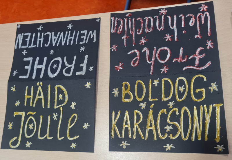 Einen Adventskalender für die eigene Klasse bastelte die Klasse 5c aus leeren Milch- und Saftkartons. Schneemänner aus Kronkorken, Schlitten aus Eisstielen und Weihnachtssterne aus Zeitungspapier wurden nach Estland und Ungarn verschickt. Außerdem schmückten sie auch den eigenen Klassenraum in der Weihnachtszeit.