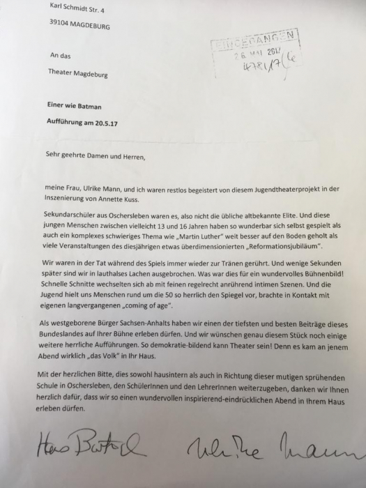 Nicht nur die Aufführungen im Theater Magdeburg und in unserer Schule wurden ein voller Erfolg, auch die Teilnahme am Theatertreffen des Landes Sachsen-Anhalt in Halle bleibt für alle Teilnehmer in guter Erinnerung.